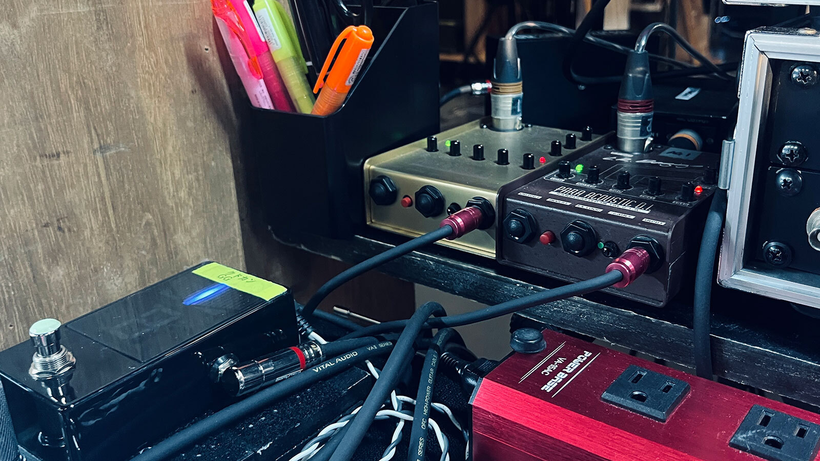 楽器隊の多彩なギター/ベースサウンドをリアルタイムに切り替え、舞台の進行に合わせてコントロールしているのが、楽器全般のローディを担当する上甲陽仁氏。歌・アコギ・ガットギターを担当する峯田さんと、エレキギター担当の宮藤さん、ベース担当のよーかいくんは演奏と演技を頻繁に行き来するため、エフェクターやアンプの切り替えなどは上甲氏が管轄する舞台裏の機材エリアですベて行われています。