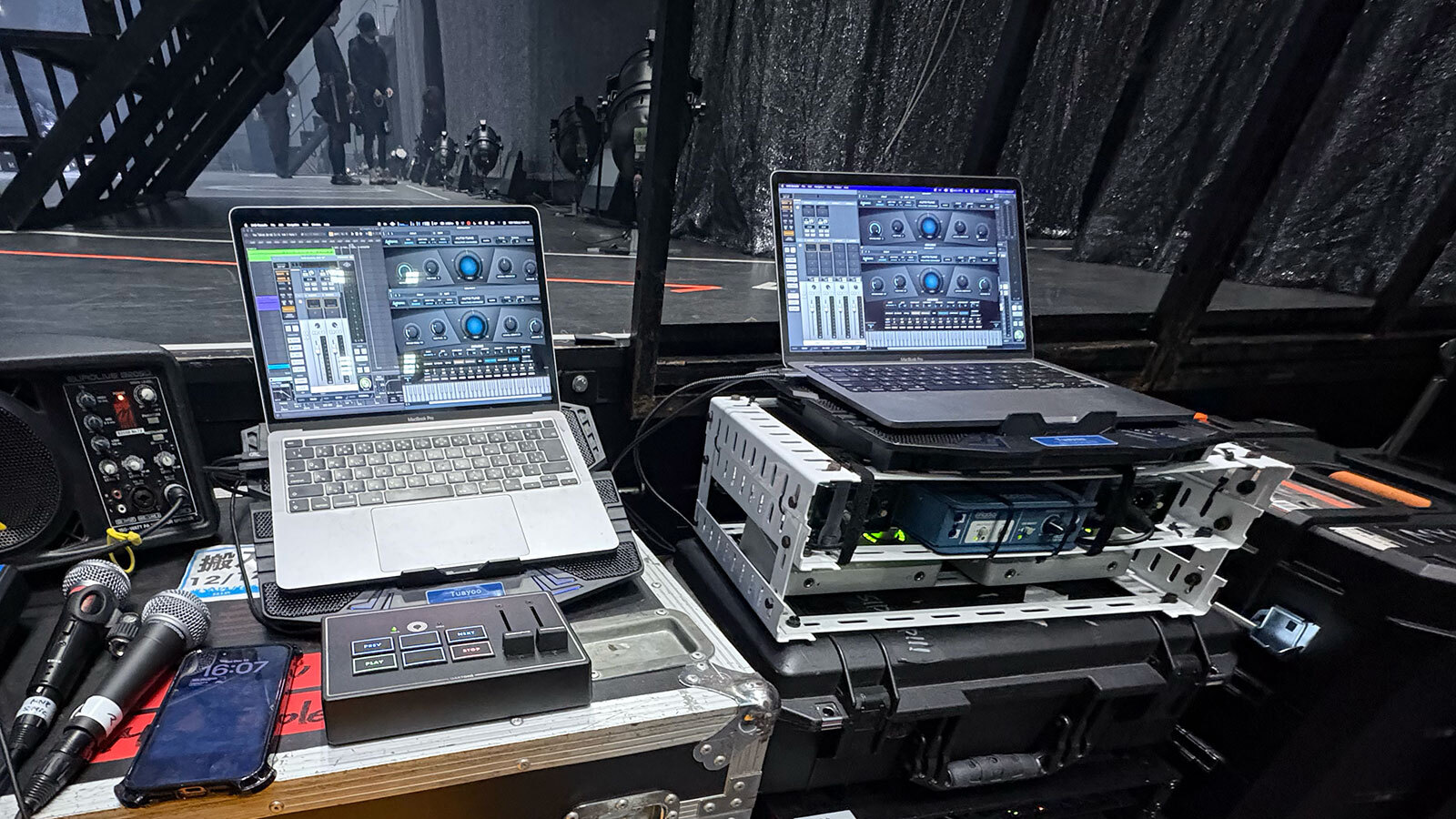 客席側の音を作るPAエンジニアはFOHにいるのですが、今回の OCTPATH のようにメンバーが7〜8人いるボーカルグループの場合、PA側でマイクの音をケアしながらシーケンスやエフェクトの細かいパラメーターまで手を回すのは不可能です。そのため、基本的にはプレイバックエンジニア(※バッキングトラックやクリック音を再生し、ステージの演奏と同期させる専門職)である僕が Auto-Tune で処理した音がそのままPAに送られ、客席側に出力されるという形をとっています。