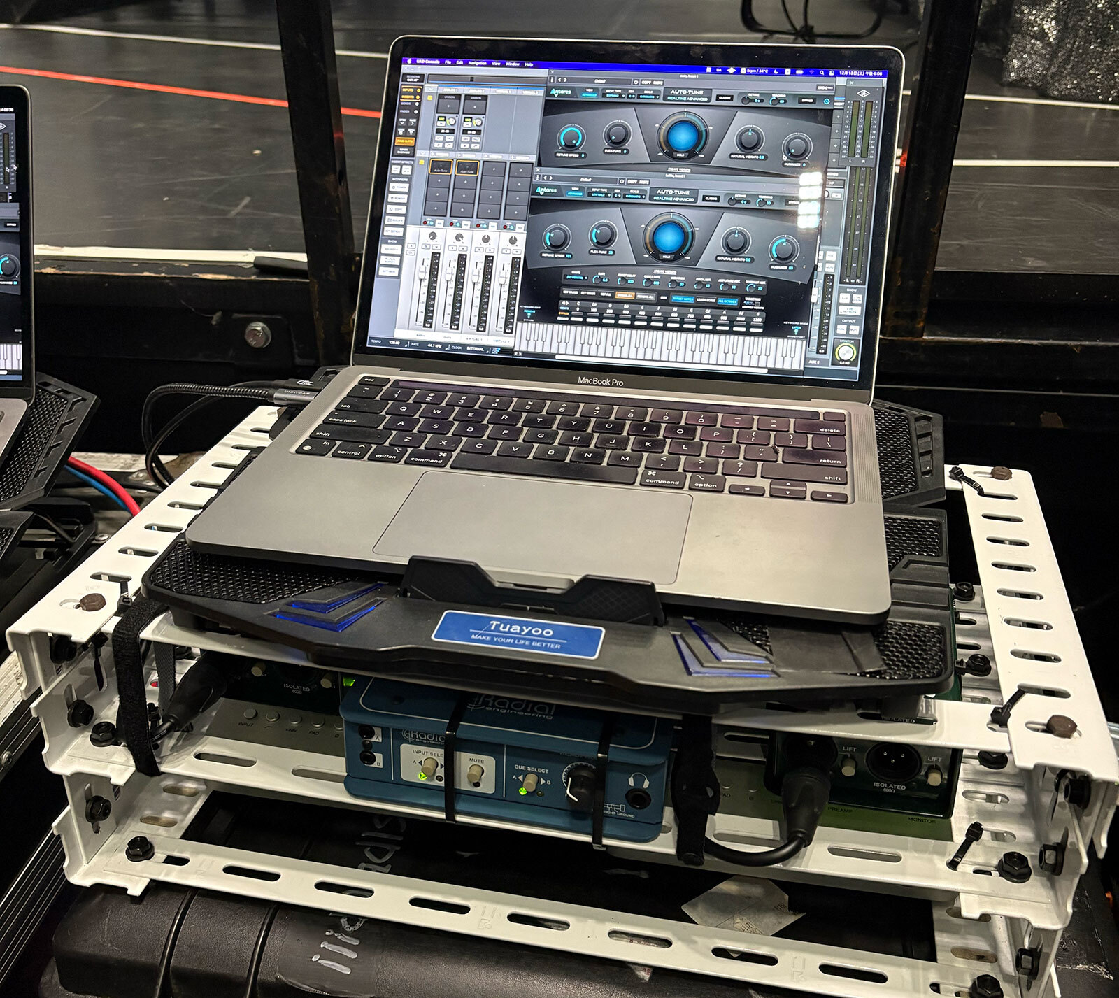 はい。主に Auto-Tune をかけるための専用システムとして Mac と Apollo Solo(オーディオインターフェイス)を1台ずつ専有させています。そして万が一のトラブルに備えて、全く同じシステムをもう1セット、バックアップとして走らせています。最大のポイントは、Auto-Tune のパラメーターをすべてMIDIでコントロールしている点です。