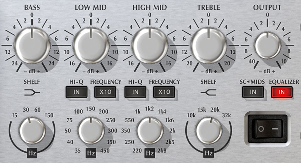 Hi Q はミッドレンジの帯域幅を狭く(Q値=0.85)してピンポイントなコントロールを可能にします。X10 はミッドレンジの中心周波数を10倍に広げます。