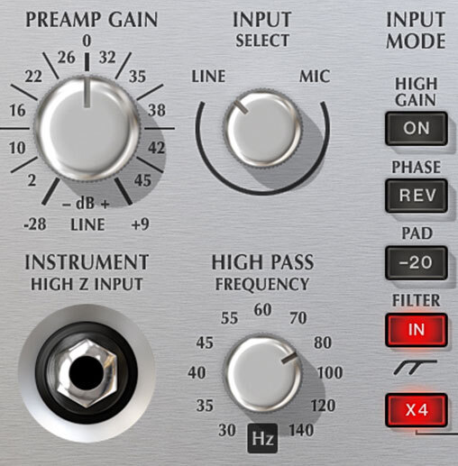 入力信号に適用されるゲイン量を調整します。数値を上げると回路が強くドライブされ、チューブトーンがより多く付加されます。MIC 設定時は0dB〜+45dB、LINE 設定時は-28dB〜+9dBの範囲で使用可能です。
