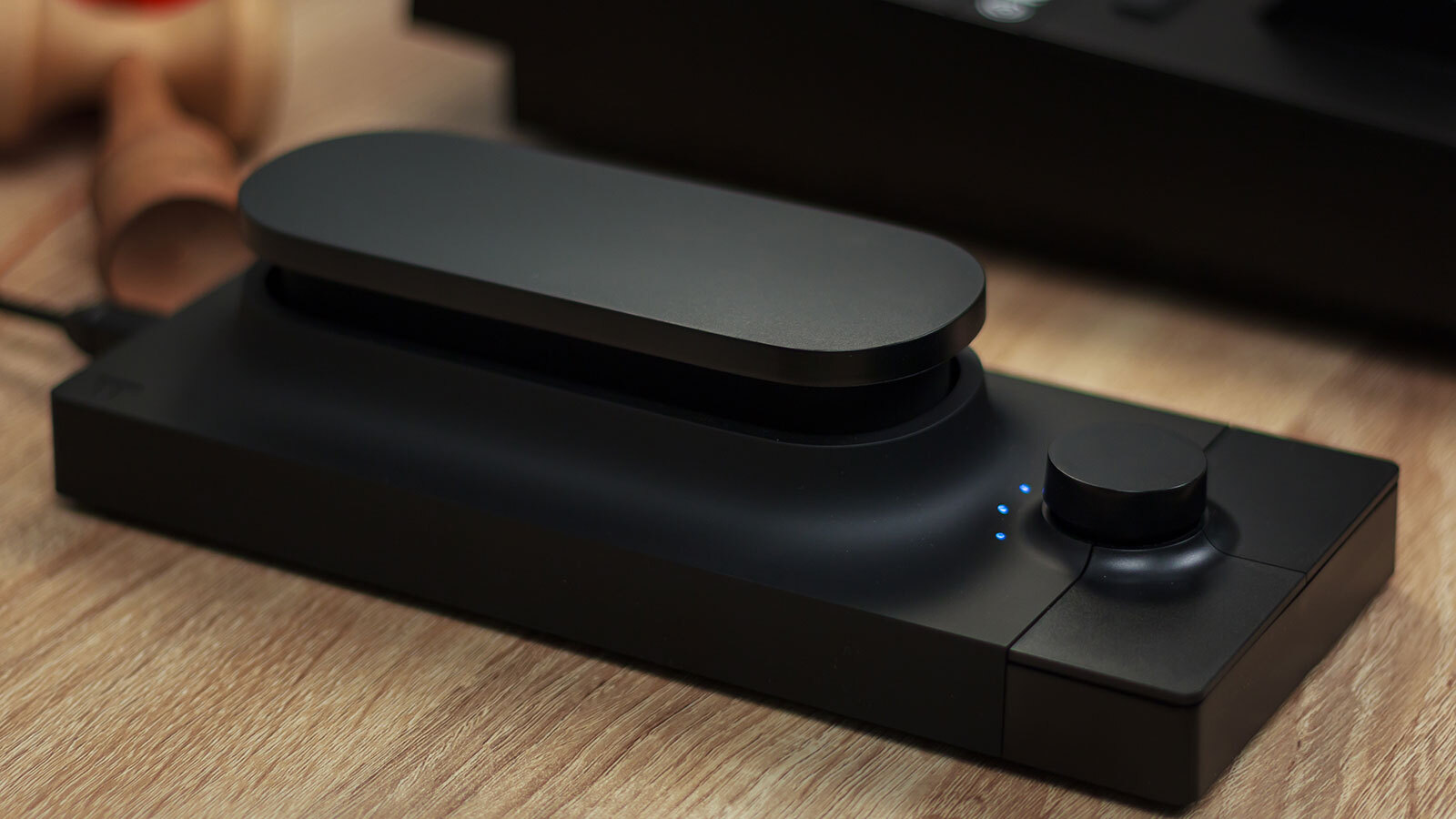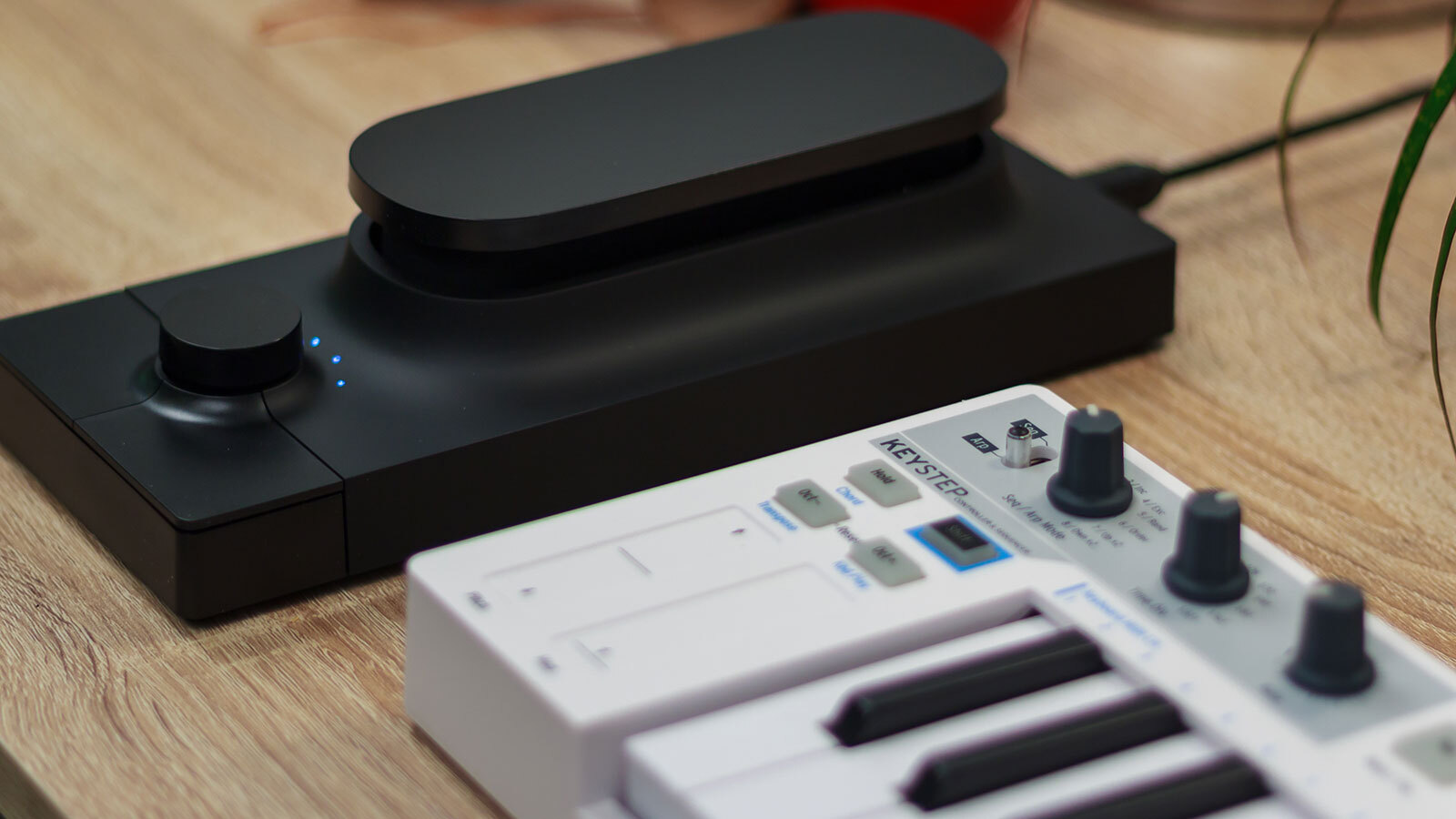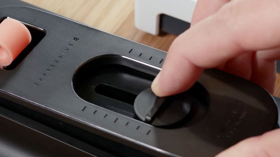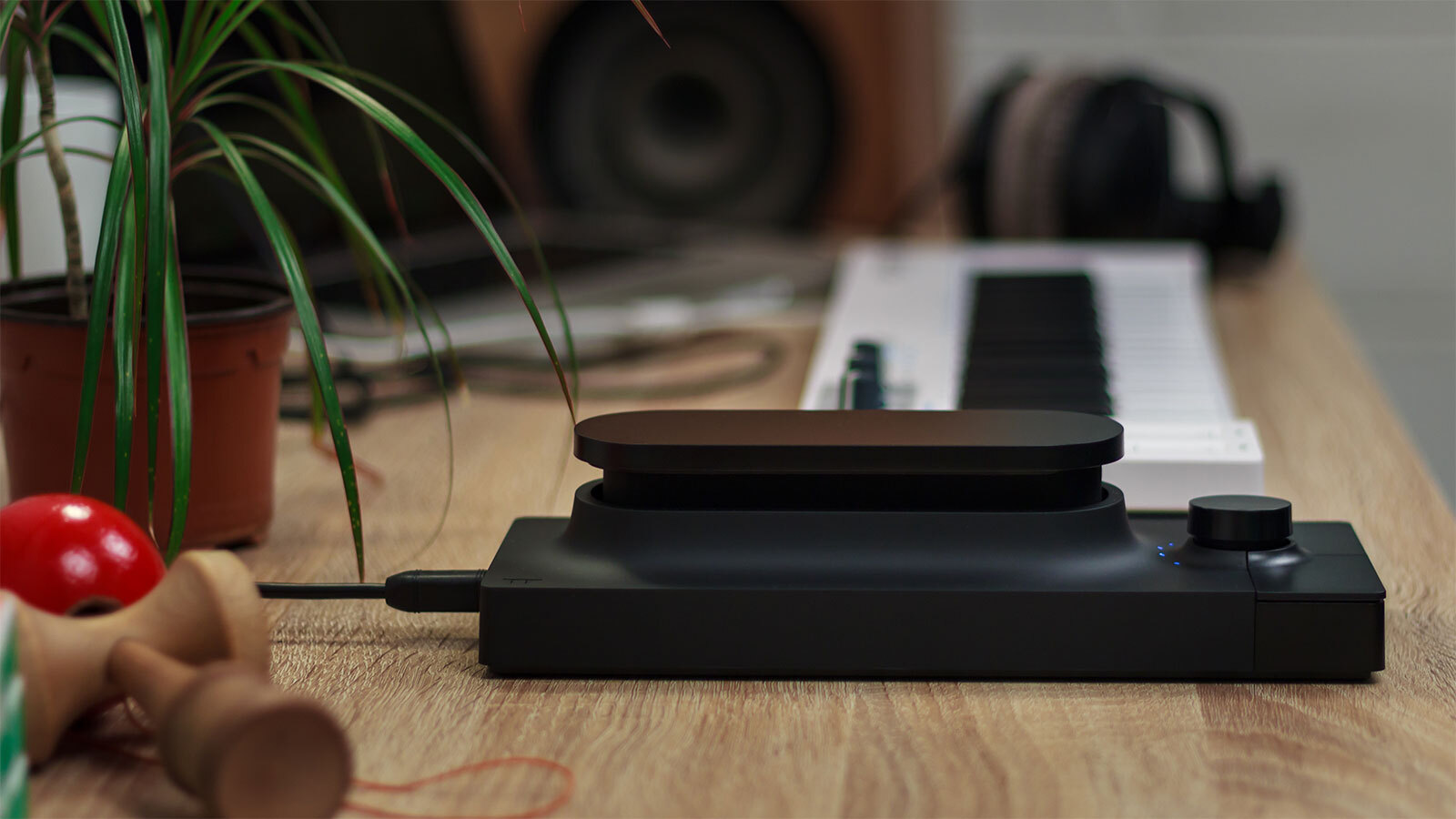 頭から爪先まで黒一色、スタイリッシュな印象でどの機材と合わせてもしっくり来るデザインです。マグネット式のスキンを外すと、フニフニしたシリンダーと横軸方向の剛性を調整するスライダーが出現。目盛り付きで分かりやすく、上へスライドするほど固くなり、下へスライドするほどプリンのように柔らかくプルプル震えやすくなります。スライダーの上下には Expressive E と Touché SE のロゴが確認でき、スキンに隠れてさり気なく刻まれている控えめさが好印象です。本体下部には圧力の感度を8段階で調整する「エンコーダー」があり、演奏中でもサッと回して柔軟に切り替えることが可能です。背面には USB の接続端子1つのみ。別途電源を用意する必要もなくケーブル1本で手軽に使えるため、持ち運んで外出先でも活用しやすいのではないでしょうか。全体的に素晴らしい質感で、洗練されたガジェット感が心をくすぐります。