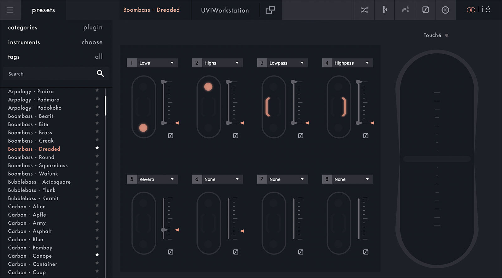 Touché SEに付属する専用ソフトウェア「Lié」は、任意の VSTi を読み込んで自由にアサインしたり、各パラメーターの範囲やカーブを細かくカスタマイズすることができます。また入力した演奏データをリアルタイムで視覚化してくれるので、複雑な演奏やアサイン状況でも分かりやすく理解することができます。加えて Lié には200以上ものプリセットサウンドが付属しており、どれも即戦力で使えるクオリティと Touché SE の表現力を体感するには十分すぎる内容です。