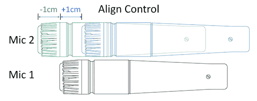 Sphere プラグインの "ALIGN" コントロールは、2つの仮想マイクモデルを最大2cmの間隔で前後させることが可能です。+1cmに設定した場合、マイク2はソースから1cm遠ざかります。0cm設定はマイク1と2が揃っている状態で、-1cmに設定した場合はマイク2がマイク1よりもソースに1cm近い状態になります。