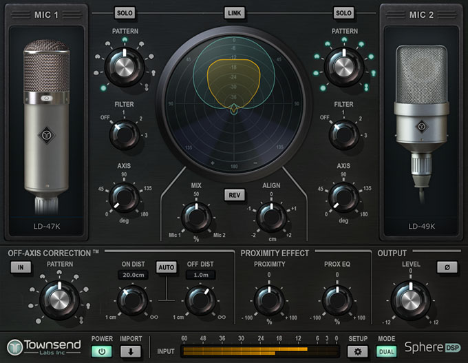Townsend Labs の Sphere テクノロジーは、近接効果を含むマイクロフォンの幅広い特性を3次元で捉えます - これは空間内のあるポイントにおける音場の圧力と方向性を個別に標本化することで可能となり、結果、モデリングアルゴリズムがマイクロフォンのトランジェントや周波数に依存する指向特性までを再構成することができるようになるのです。