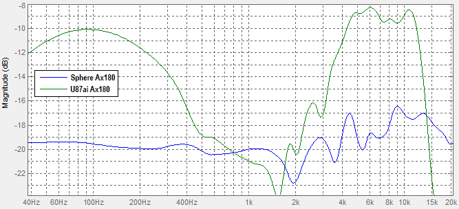 一目で分かる通り、Sphereの特性はよりフラットです。U87 の特性は16dB以上の差がありますが、Sphere マイクは約6dB程度で全体的に滑らかです。Neumann で180度オフアクシスの音がフラットではないのは不思議なことではありません。Sphere マイクを使えば補正が可能となり、はるかに滑らかな特性になるため、自然なルームアンビエンスを得る際に適しています。