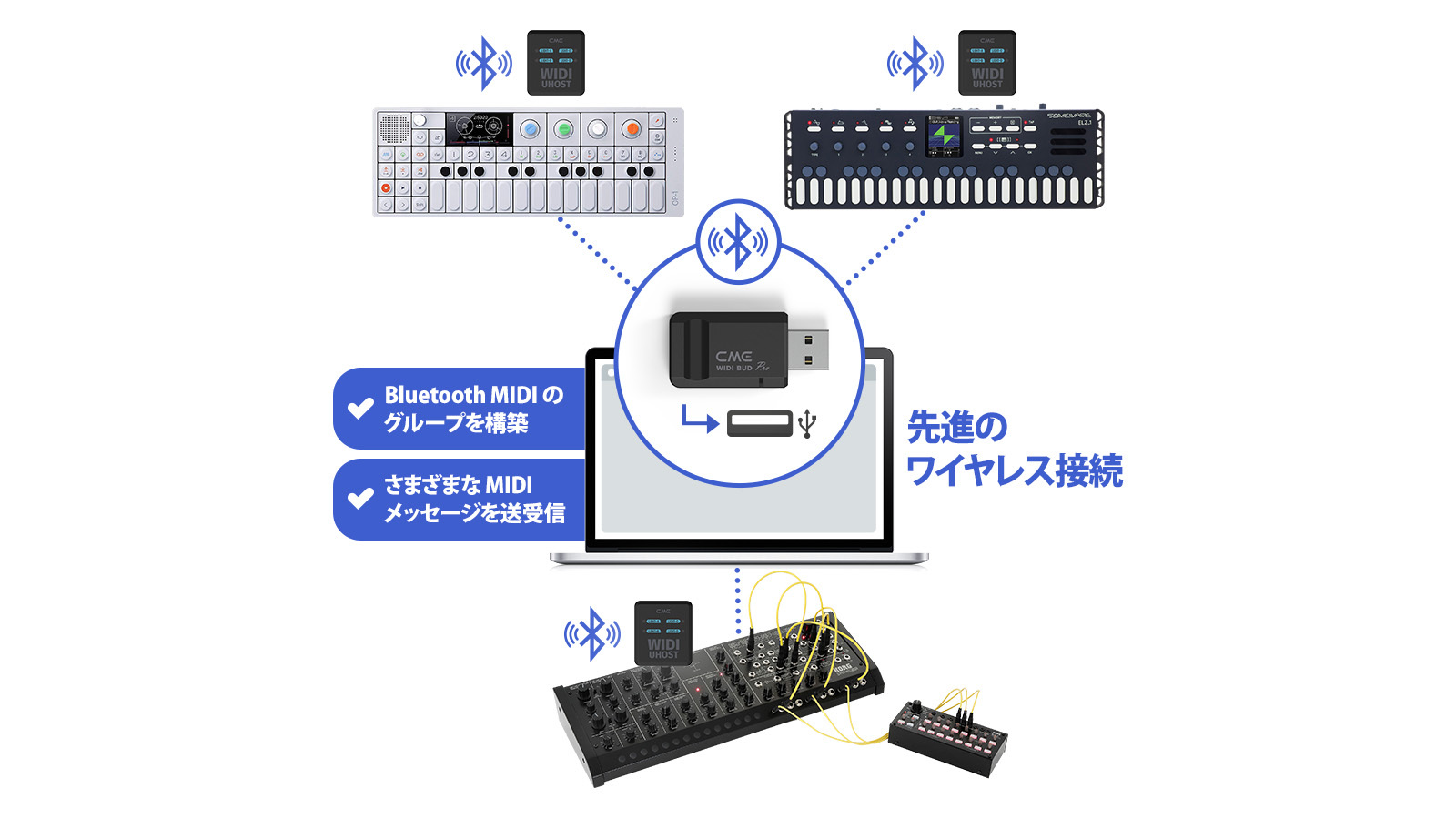 幅広いOSに対応する、高機能ワイヤレス USB MIDI ドングル