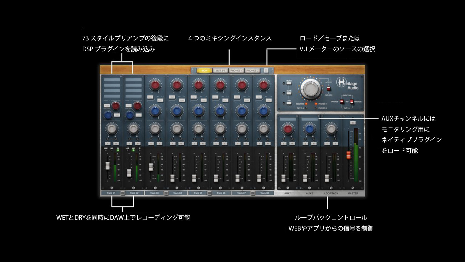 ユニークなモニタリングツールでは Heritage Audio 社製の DSP プラグインを立ち上げることができ、WET と DRY 信号を DAW へ同時にレコーディング可能です。さらに、モニタリング用にAUXセクション上でネイティブプラグインを立ち上げ、快適なモニタリングを実現することもできます。4つのミキシングインスタンスを使って直感的なルーティングコントロールも可能です。