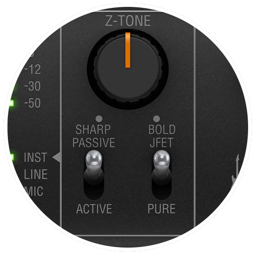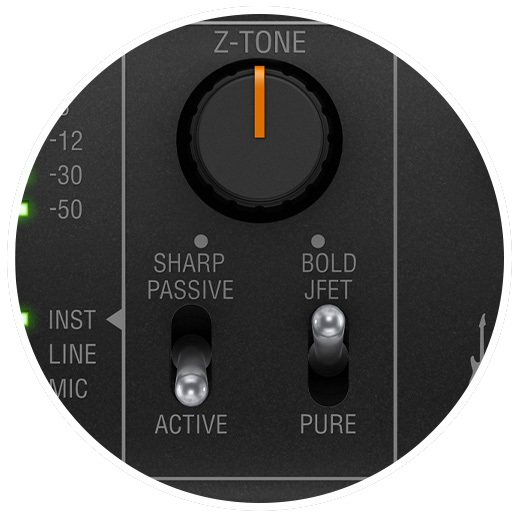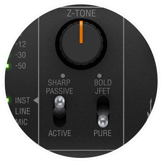 特許出願中の Z-TONE™ サーキットでは、接続されたギター、ピックアップ、欲しいサウンド・キャラクターに合わせて、入力インピーダンスを 2.2 kΩ(BOLD)から 1 MΩ(SHARP)の間で、連続的に調整することができます。