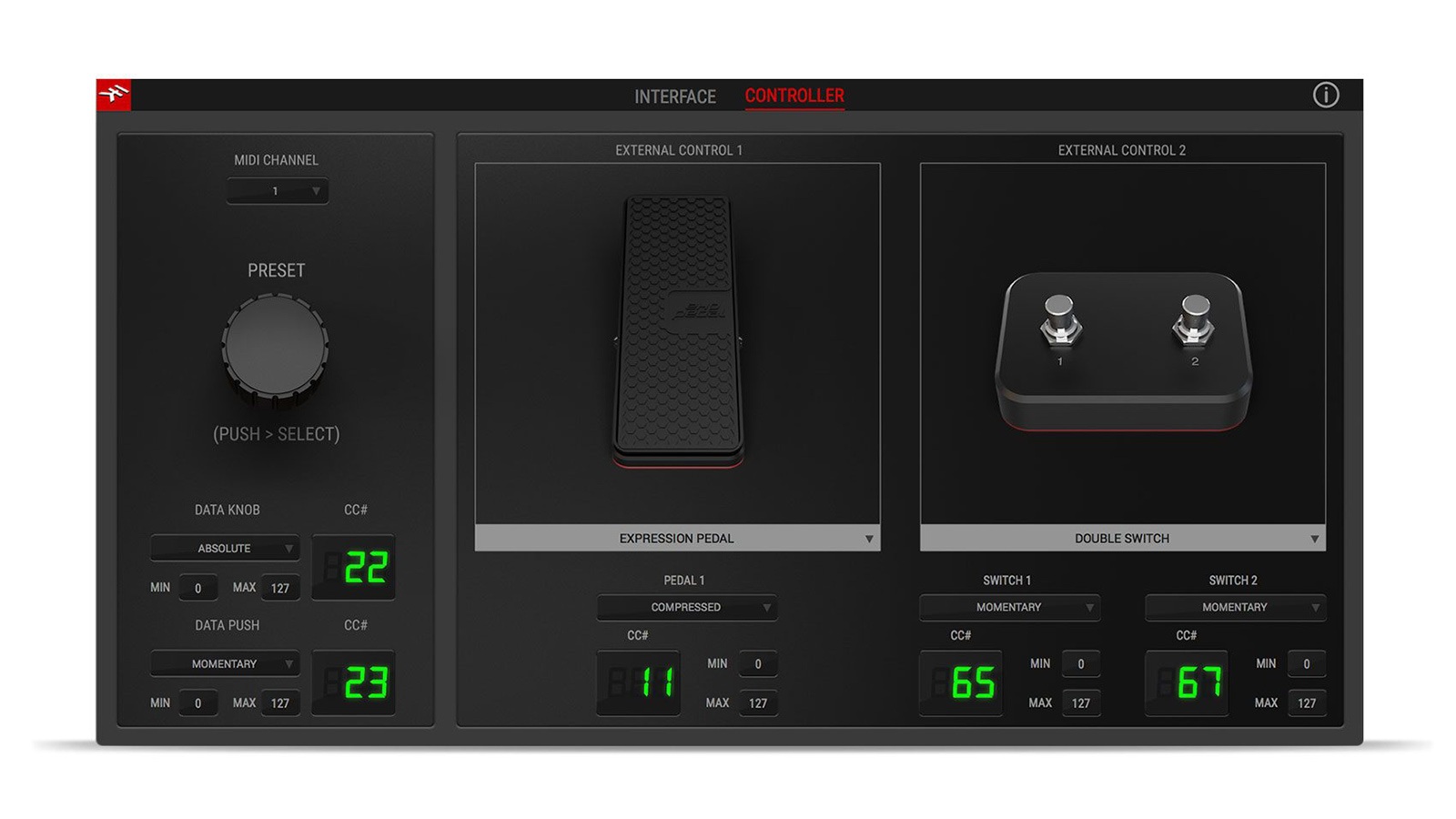 CONTROLLER タブでは、PRESETノブと2つのコントローラー入力に接続されたペダル操作時の動作(ノブの相対/絶対値、スイッチのラッチ/アンラッチ等)、MIDIチャンネル、MIDI CC 番号、CCの最小値 / 最大値など、制御したいアプリケーションに応じた最適な設定が行えます。