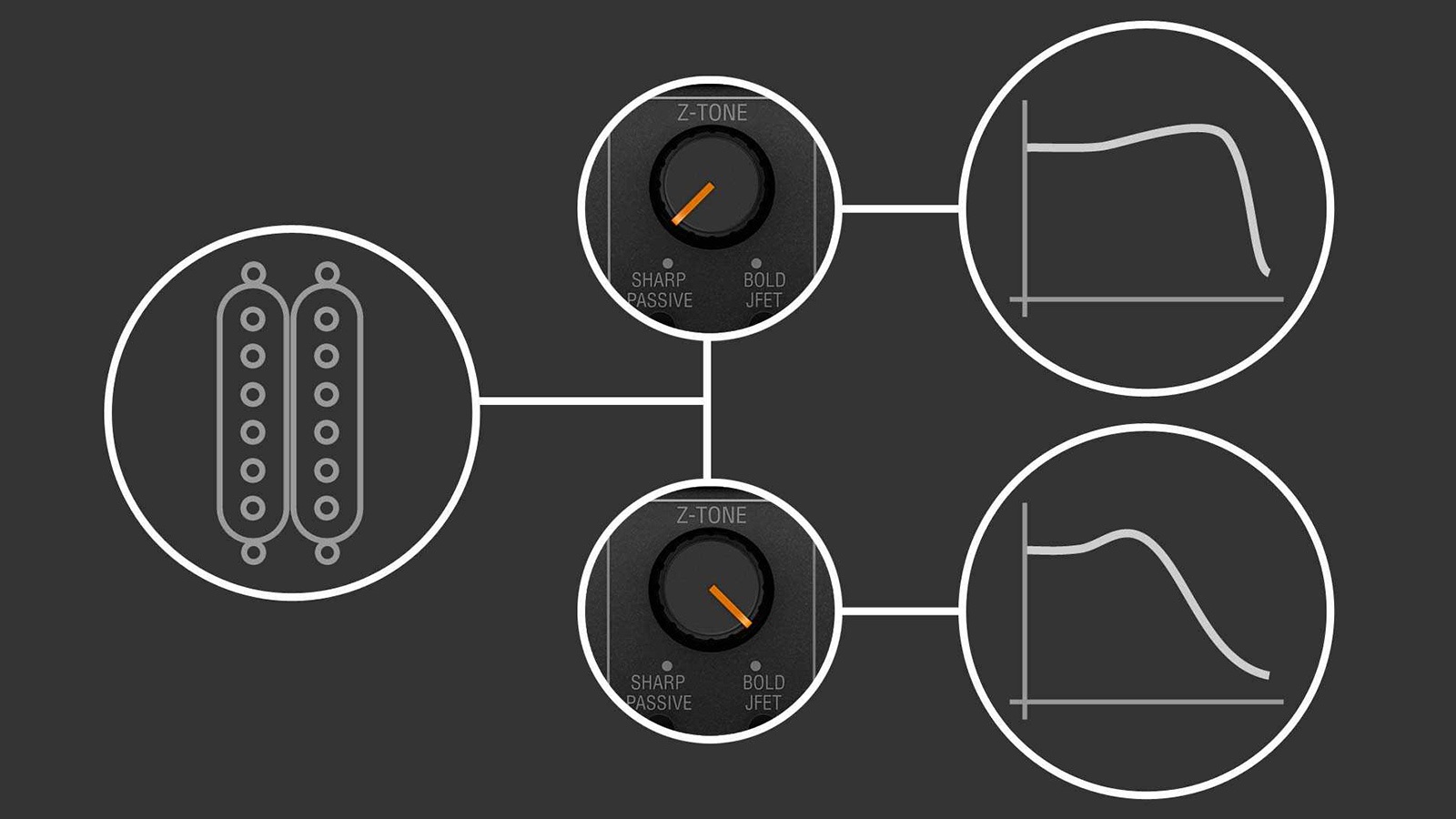 特許出願中の Z-TONE™ サーキットでは、接続されたギター、ピックアップに合わせ、入力インピーダンスを 1 MΩ(SHARP)から 2.2 kΩ(BOLD)の間で、連続的に調整することができます。