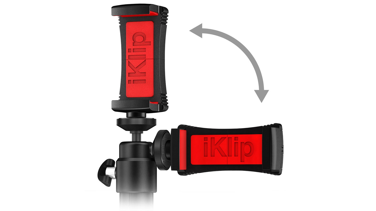 iKlip GO は自由に幅が調節可能なホルダー部により、スマートフォンをしっかりと固定できます。またボール・ジョイント方式による角度調節機構を採用しており、縦、横、角度は自由自在。角度は90度の調節が可能で、360度回転します。