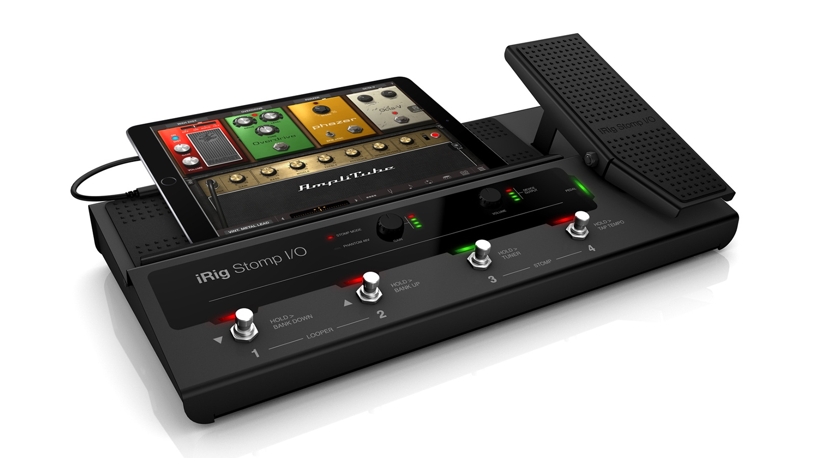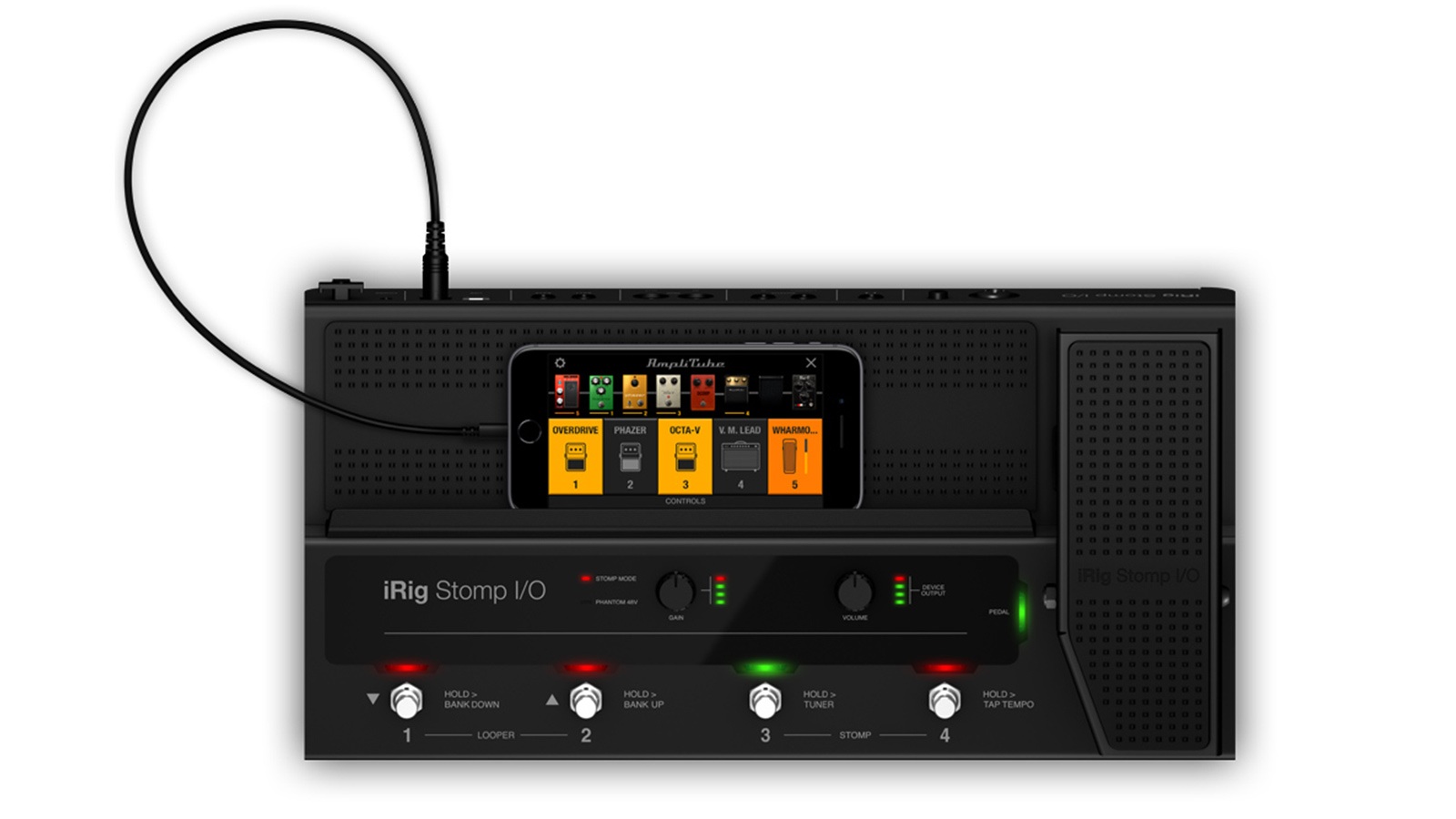 iRig Stomp I/O は、4つのフット・スイッチ、エクスプレッション・ペダルに、オーディオ/MIDI インターフェイス機能を統合したペダルボード・コントローラーです。