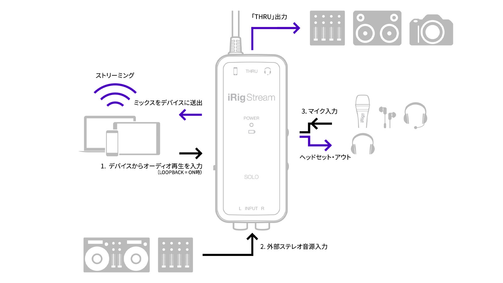 iRig Stream Solo には、接続したデバイスの出力音声をループバックさせる機能も搭載されています。接続したデバイスのお気に入りの音楽アプリでバッキングトラックを鳴らし、それに合わせた演奏や歌をミックスしてストリーミング配信することも可能です。