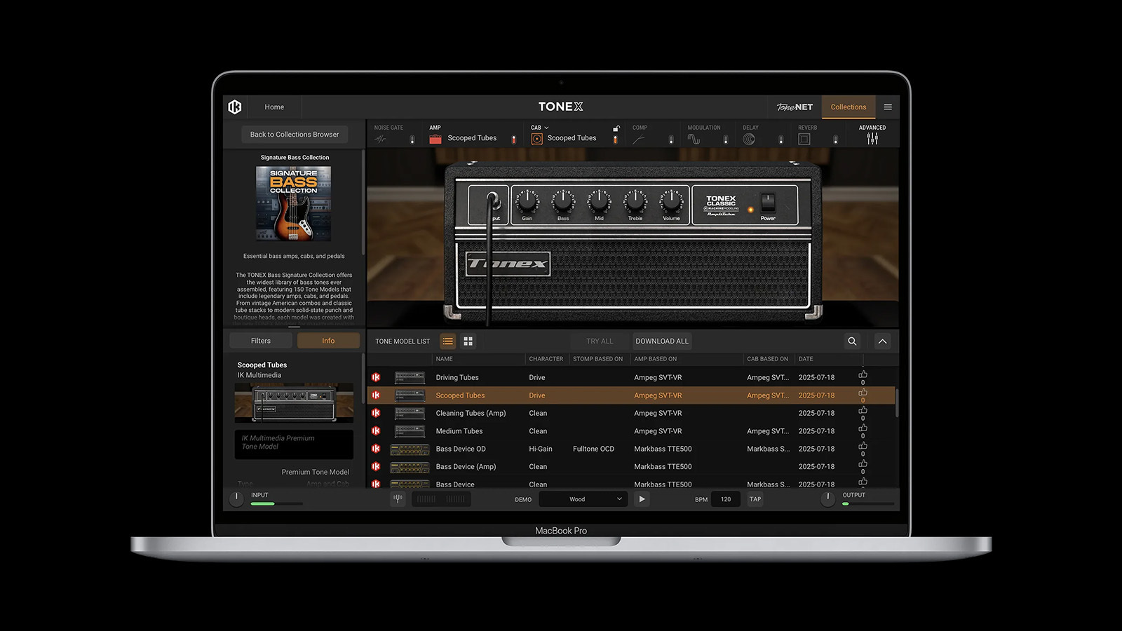 TONEX Signature Bass Collection の Tone Model は、TONEX Modeler によってキャプチャーされました。TONEX Modeler でキャプチャーされた Tone Model は、Dry / Wet の位相が改善され、DI とアンプ・サウンドのブレンドがより自然で一体感のある仕上がりになっています。クリアな低域の基音に、ドライブやサチュレーションが心地よく重なることで、密度感とパンチを両立し、ミックス内で安定した存在感を発揮します。