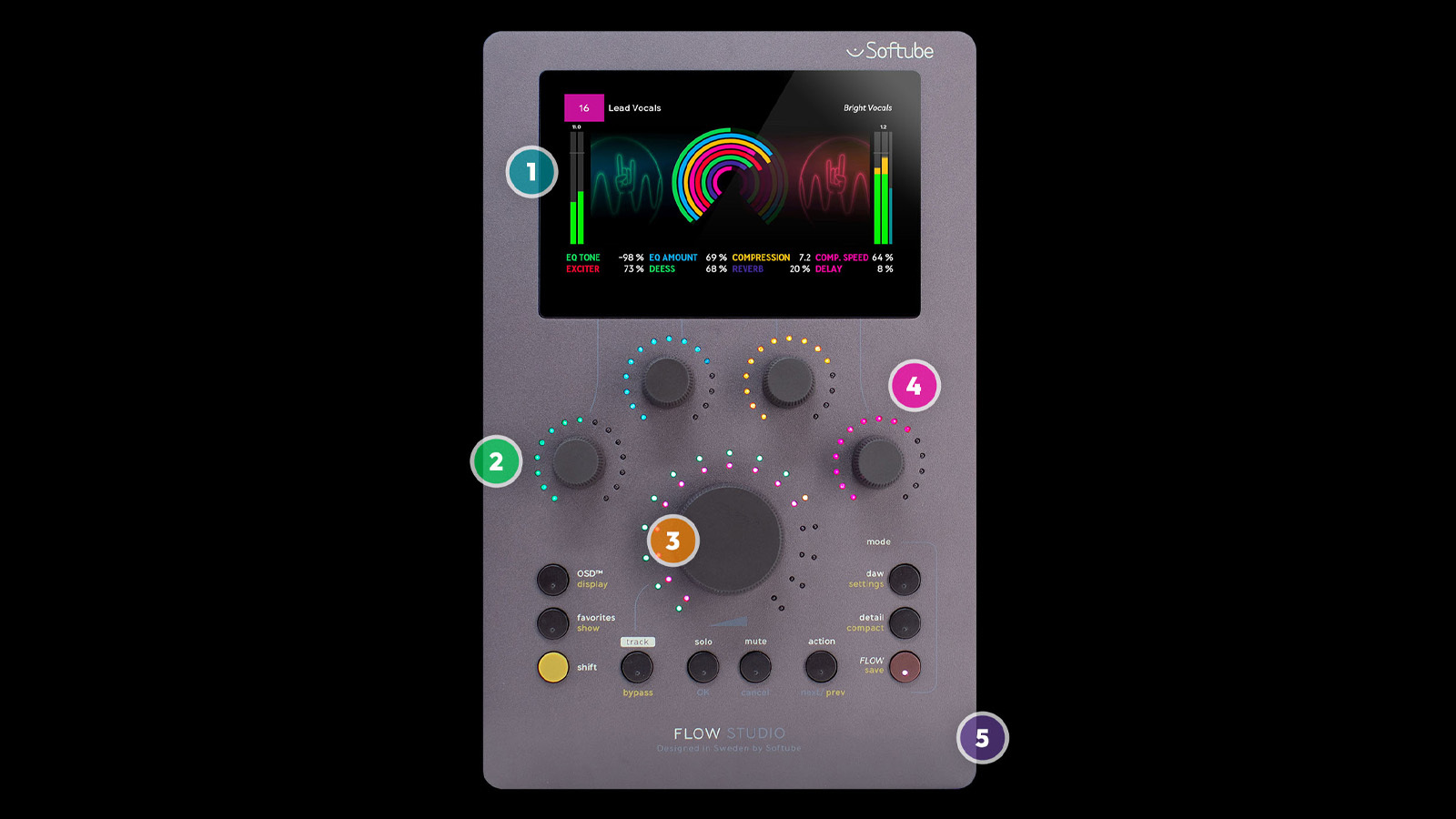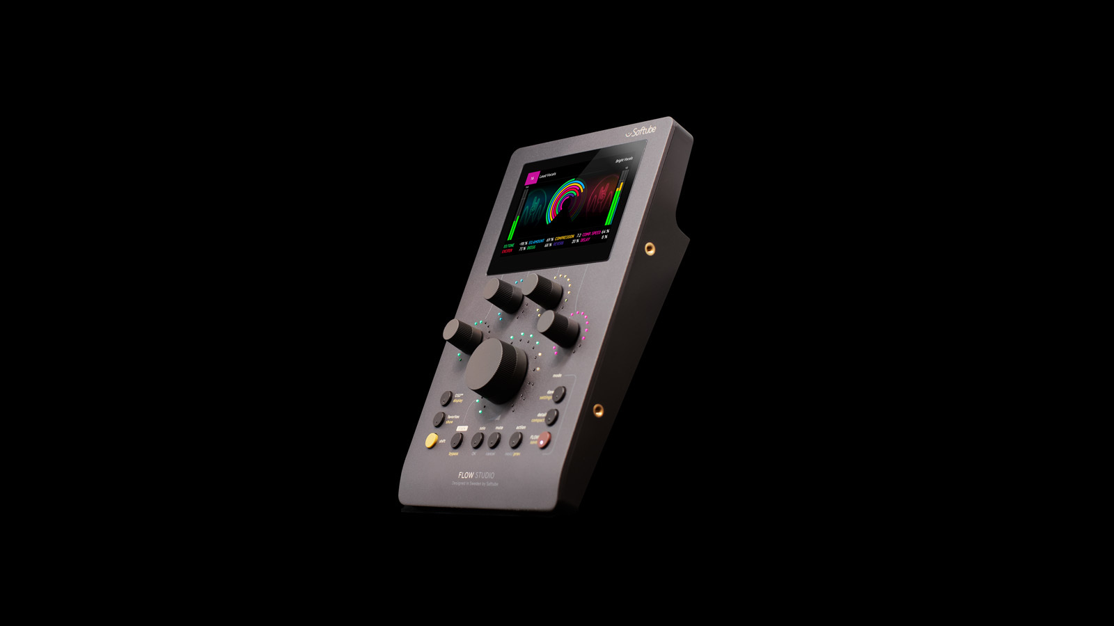 EQ カーブ、ゲイン・リダクション、リバーブの残響、マイクの位置、メーター表示。Flow Studio の4.3インチ・ディスプレイは、制作のどの段階にあっても、どのようなエフェクトをコントロールしていても、最適な表示でサウンドを自在に操れるよう、十分な大きさを備えます。