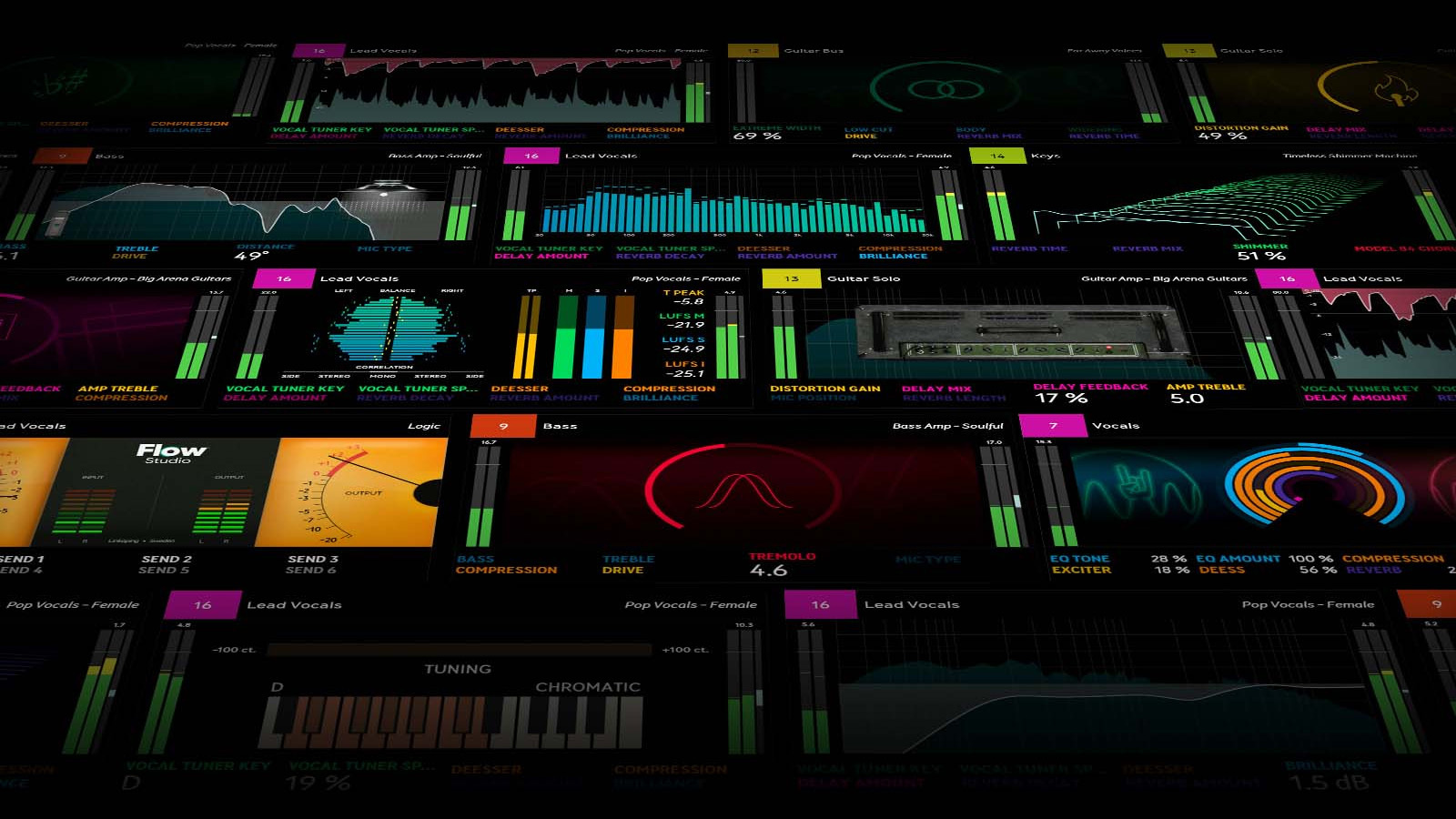 Flow Studio には、Flow Studio Suite が付属します。これは Flow Mixing Suite プラグインで動作する100種類以上のシグナル・チェーンのコレクションであり、ボーカル、ギター、シンセ、ドラムといったサウンドの魅力を増し、音楽制作における新たなアイデアや方向性を刺激するものです。一流のサウンド・デザイナーや音楽プロデューサーによって構築されたこれらのチェーン(Flow)を使えば、マクロノブを回すだけでサウンドが瞬時に変化し、わずか数秒でドライな録音素材をドラフトミックスへ昇華させることができます。