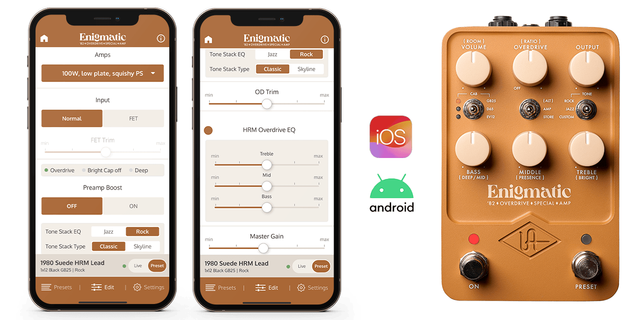 UAFX Control モバイル・アプリを使えば、Enigmatic '82 のすべてにアクセスできます。プリセットのカスタマイズ、保存、管理、アーティスト・トーンの呼び出し、そして最大4つの内蔵プリセットとライブモードに対応するフットスイッチ・モードの設定などを、安定した Bluetooth 接続で行えます。