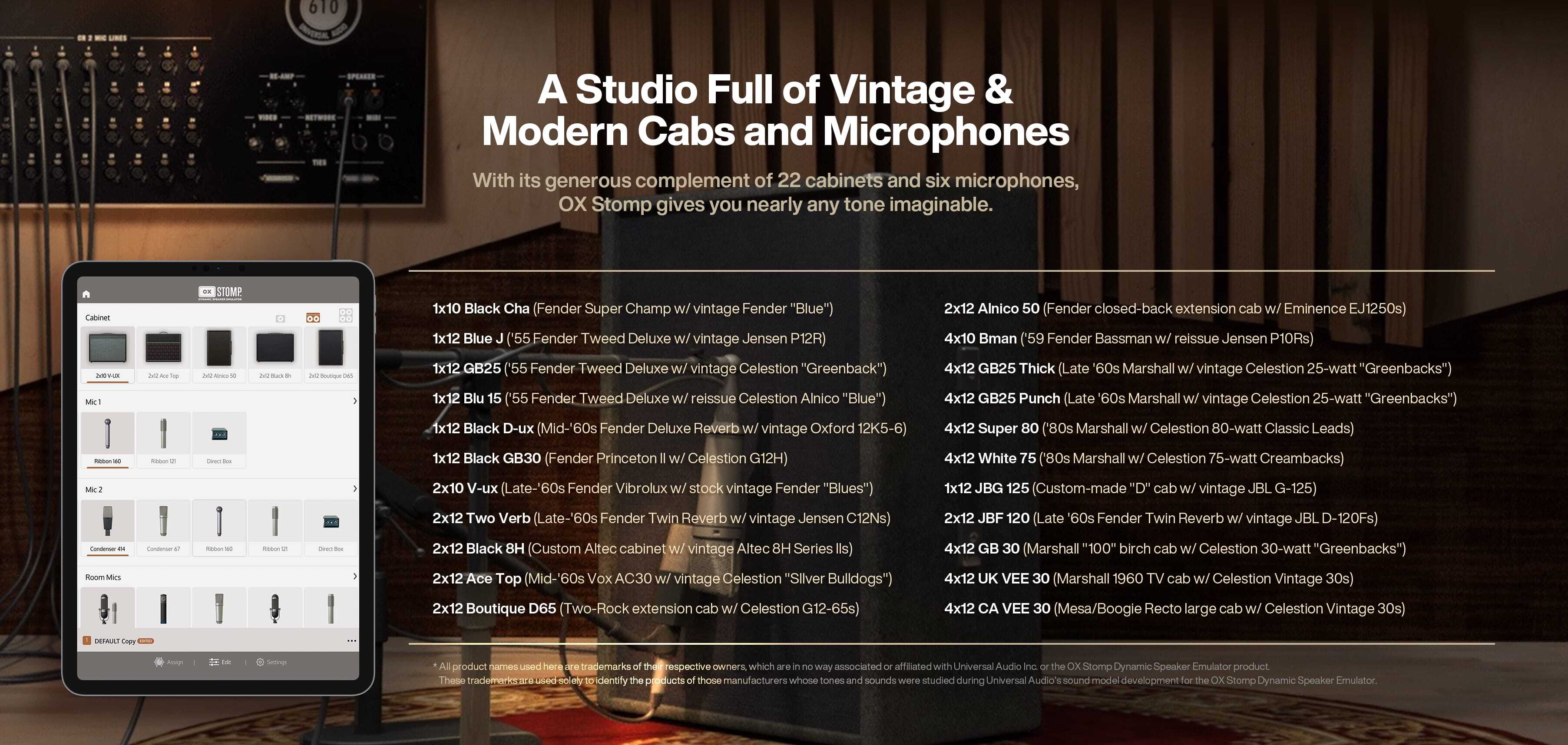 OX Stomp は、キャビネットに対し巧みにセットされたコンデンサーマイクやダイナミックマイク、リボンマイクだけでなく、ダイナミック・ルーム・モデリングによってルームマイクの素晴らしいセレクションまでをも提供する唯一のペダルです。これにより、ワールドクラスのトラッキングルームでクランクしたアンプをレコーディングする際に得られる、あの空気を押し出すような感覚をリアルに体験できます。