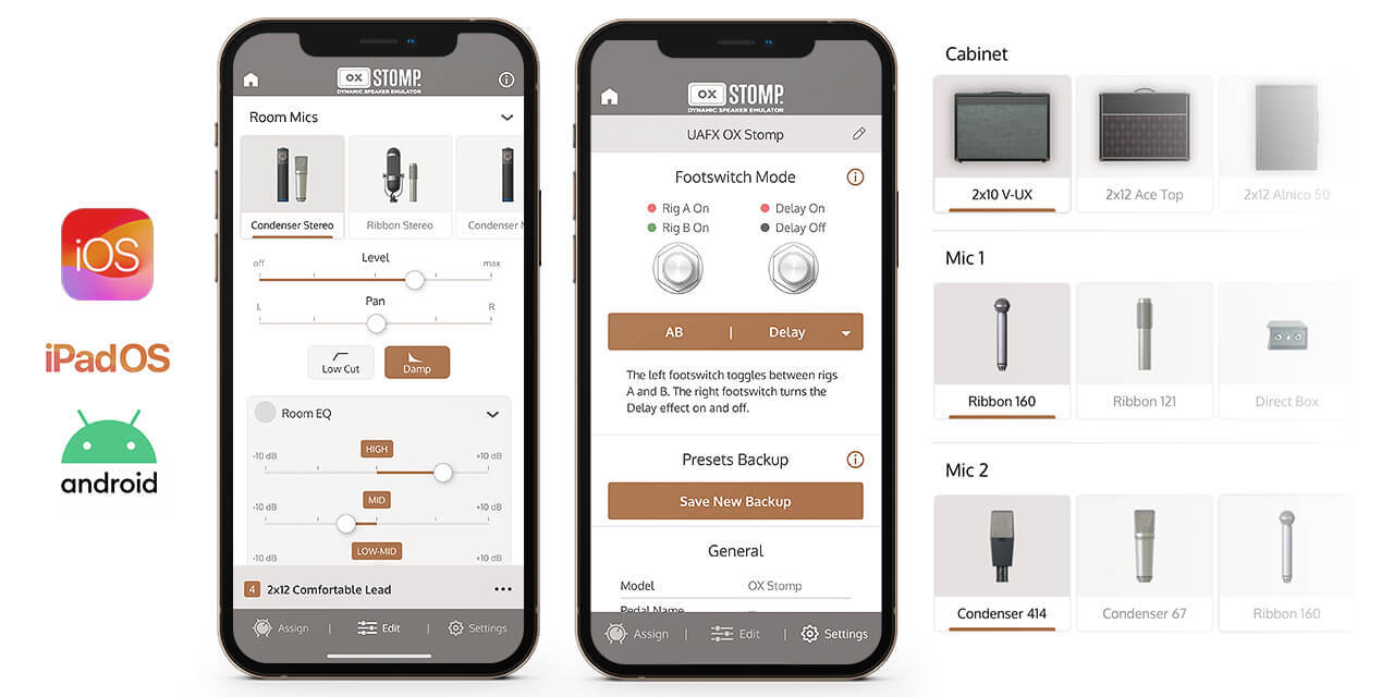 UAFX Control モバイル・アプリを使えば、キャビネットやマイクの交換、エフェクトの微調整、RIG プリセットの割り当て、フットスイッチによるサウンドやエフェクトの切り替えなど、さまざまな操作を簡単に行えます。スマートフォンと USB で直接接続することも、Bluetooth 経由で安定したコントロールを楽しむこともできます。