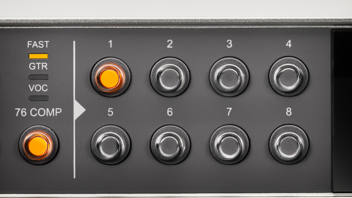 Volt 876 に搭載された8基の 76 コンプレッサーは、UA の名機 1176 リミッティング・アンプからインスピレーションを得たアナログ回路で、理想的なパンチと存在感を与えてくれます。76 コンプレッサーには、ボーカル、ギター、シンセ、ドラム(ファースト・モード)といったサウンドをコントロールするためのプリセットが用意されており、設定を選ぶだけで、瞬時に素晴らしいサウンドを得られます。