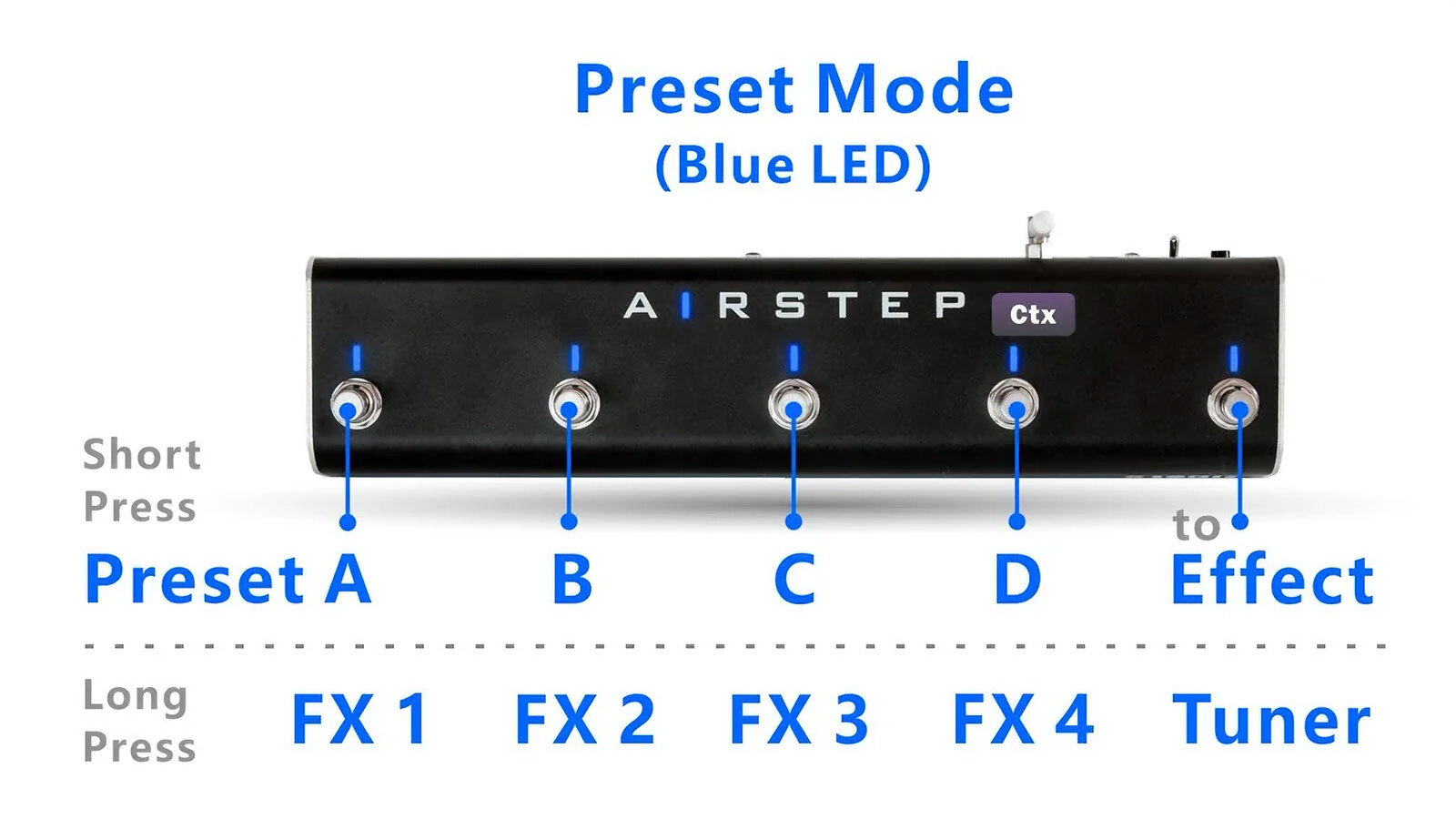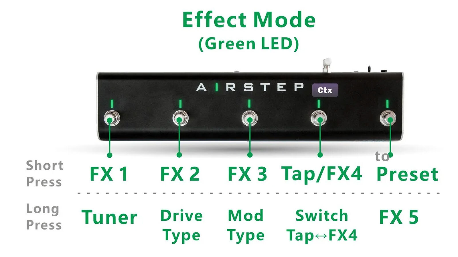エフェクトモードでは、Nano Cortex に内蔵されているエフェクト、アンプやキャビネットシミュレーターのオン/オフの操作が可能です。それぞれのエフェクトはスイッチのショートプレス/ロングプレスの踏み分けで操作することができます。