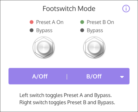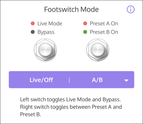 Lion '68 は、デフォルトで “Live|Preset” モードに設定されています。UAFX Control モバイル・アプリを使って、フットスイッチの割り当てを変更することができます。