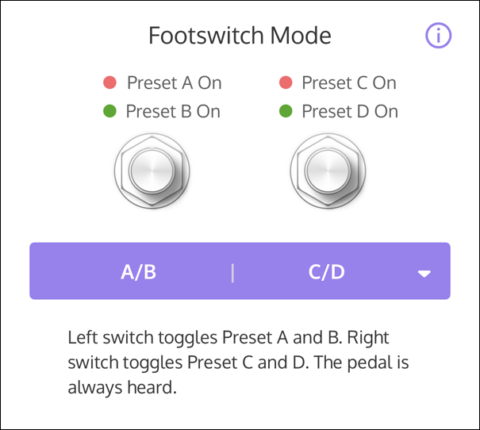 A/B | C/D モードでは、4つのプリセットサウンドを切り替えることができます。ペダルは常にオンで、バイパスできません。