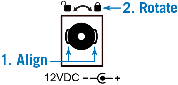 重要:これらのモデルには、誤って外れるのを防ぐためのロック式電源コネクタが付いています。電源を Apollo Desktop のシャーシに正しくロックしないと、ユニットの電源が断続的に切れたり、まったく電源が入らなくなったりすることがあります。挿入するときは、まず電源ケーブルのバレル コネクタの 2 つのタブ「ウィング」を電源入力のノッチに合わせます。次に、バレルを時計回りに回転させてシャーシに固定します。