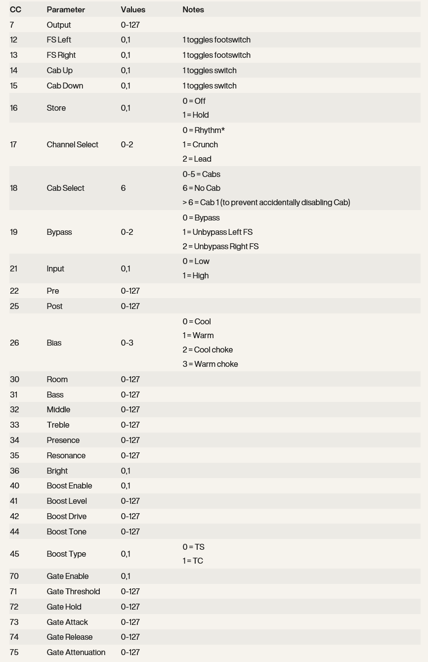 サポート トップ お知らせ お問い合わせ ユーザー登録 アカウント Universal Audio : ANTI MIDI CC マニュアル, 2025/11/12 該当製品 Universal Audio | UAFX ANTI 1992 High Gain Amp フットスイッチ用の MIDI CC は、フットスイッチの押下をコントロールします。機能はフットスイッチ・モードによって異なります。特に記載がない限り、値が 0、1 の CC は、0 = オフ、1 = オンと定義されます。 *リズムモード(Clean、Punch、Punch+)は CC で設定できません。リズムモードを切り替えるには、プリセットを作成し、それらを MIDI プログラム・チェンジに割り当ててください。