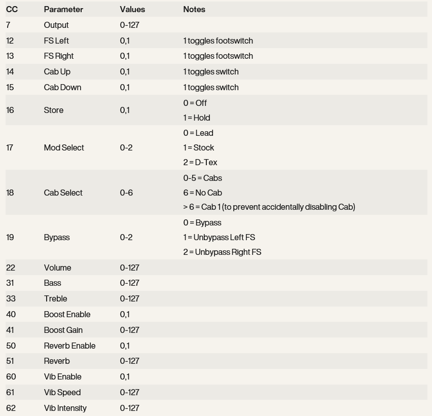サポート トップ お知らせ お問い合わせ ユーザー登録 アカウント Universal Audio : Dream '65 MIDI CC マニュアル, 2025/11/12 該当製品 Universal Audio | UAFX Dream '65 Reverb Amplifier フットスイッチ用の MIDI CC は、フットスイッチの押下をコントロールします。機能はフットスイッチ・モードによって異なります。特に記載がない限り、値が0、1の CC は、0 = オフ、1 = オンと定義されます。