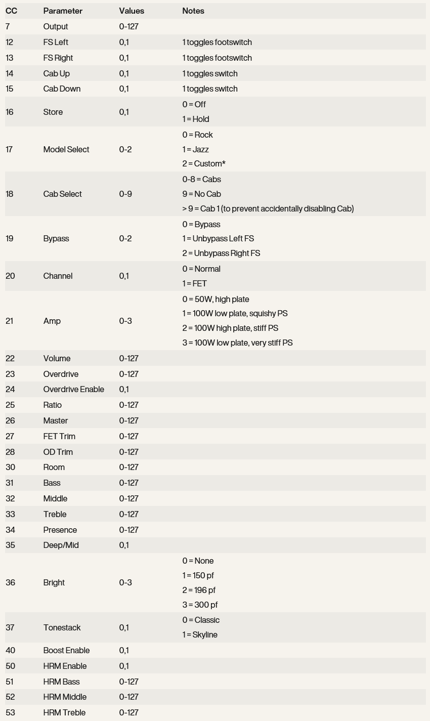 サポート トップ お知らせ お問い合わせ ユーザー登録 アカウント Universal Audio : Enigmatic MIDI CC マニュアル, 2025/11/12 該当製品 Universal Audio | UAFX Enigmatic '82 Overdrive Special Amp フットスイッチ用の MIDI CC は、フットスイッチの押下をコントロールします。機能はフットスイッチ・モードによって異なります。特に記載がない限り、値が0、1の CC は、0 = オフ、1 = オンと定義されます。 *この設定はデフォルトで ROCK モデルに設定されており、CC を使用して JAZZ に設定することはできません。UAFX Control モバイル・アプリを使用してカスタムアンプの設定を手動で編集可能です。