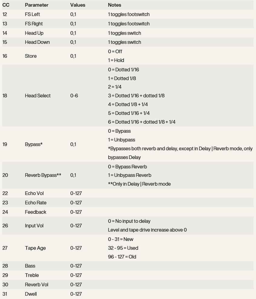 サポート トップ お知らせ お問い合わせ ユーザー登録 アカウント Universal Audio : Galaxy MIDI CC マニュアル, 2025/11/12 該当製品 Universal Audio | UAFX Galaxy '74 Tape Echo & Reverb フットスイッチ用の MIDI CC は、フットスイッチの押下をコントロールします。機能はフットスイッチ・モードによって異なります。特に記載がない限り、値が0、1の CC は、0 = オフ、1 = オンと定義されます。
