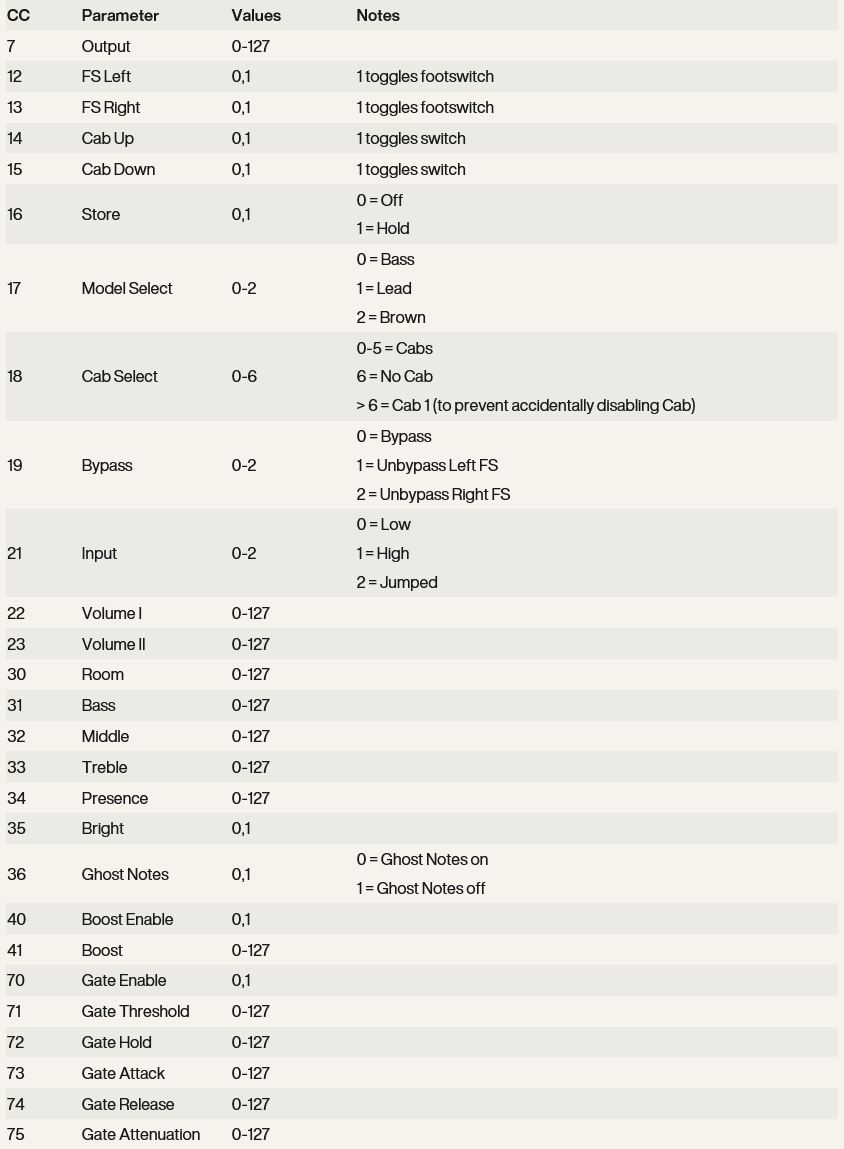 サポート トップ お知らせ お問い合わせ ユーザー登録 アカウント Universal Audio : Lion MIDI CC マニュアル, 2025/11/12 該当製品 Universal Audio | UAFX Lion '68 Super Lead Amp フットスイッチ用の MIDI CC は、フットスイッチの押下をコントロールします。機能はフットスイッチ・モードによって異なります。特に記載がない限り、値が0、1の CC は、0 = オフ、1 = オンと定義されます。