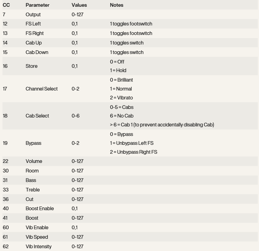 サポート トップ お知らせ お問い合わせ ユーザー登録 アカウント Universal Audio : Ruby MIDI CC マニュアル, 2025/11/12 該当製品 Universal Audio | UAFX Ruby '63 Top Boost Amplifier フットスイッチ用の MIDI CC は、フットスイッチの押下をコントロールします。機能はフットスイッチ・モードによって異なります。特に記載がない限り、値が0、1の CC は、0 = オフ、1 = オンと定義されます。