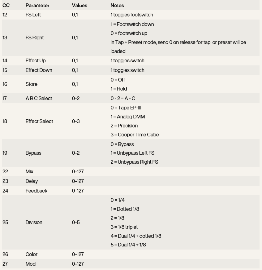サポート トップ お知らせ お問い合わせ ユーザー登録 アカウント Starlight MIDI CC マニュアル, 2025/11/12 該当製品 Universal Audio | UAFX Starlight Echo Station フットスイッチ用の MIDI CC は、フットスイッチの押下をコントロールします。機能はフットスイッチ・モードによって異なります。特に記載がない限り、値が0、1の CC は、0 = オフ、1 = オンと定義されます。