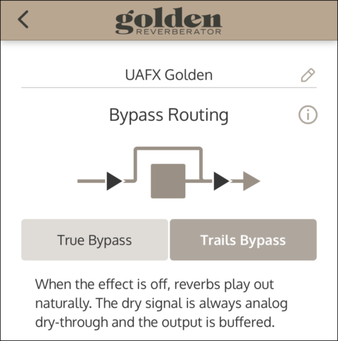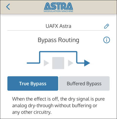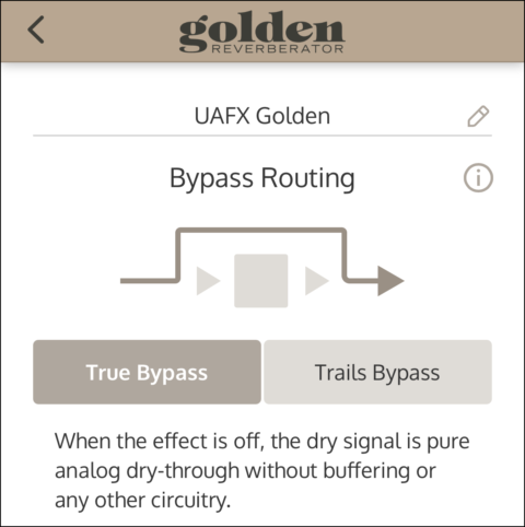 バイパス経路がトゥルー・バイパスに設定され、エフェクトがオフの場合、入力から出力までが完全なアナログ・ドライ・スルーの状態となり、バッファリングやその他の回路を介すことなく、機械的なリレーが用いられます。UAFX ペダルは、デフォルトではトゥルー・バイパスに設定されています。