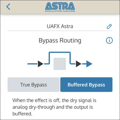 Astra のバイパス経路は、トゥルー・バイパスもしくはバッファード・バイパスのいずれかに設定できます。この設定は、エフェクトがオフの時にペダルがどのように動作するかを決定するものです。