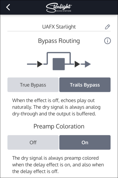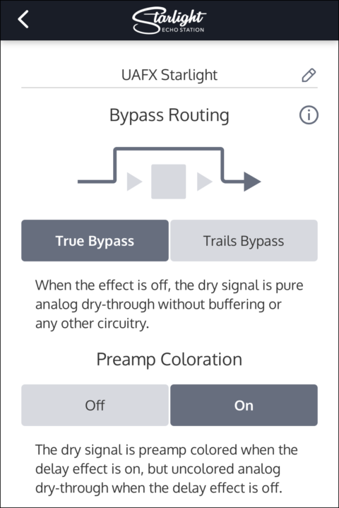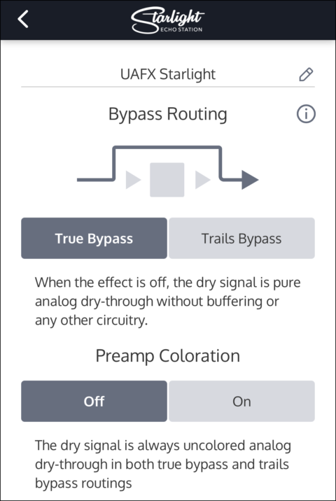 Starlight のバイパス経路は、トゥルー・バイパスもしくはトレール・バイパスのいずれかに設定できます。この設定は、エフェクトがオフの時にペダルがどのように動作するかを決定するものです。