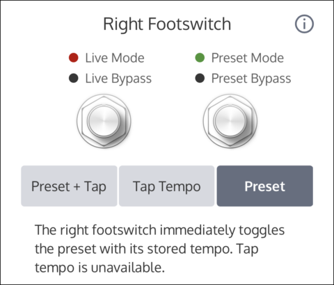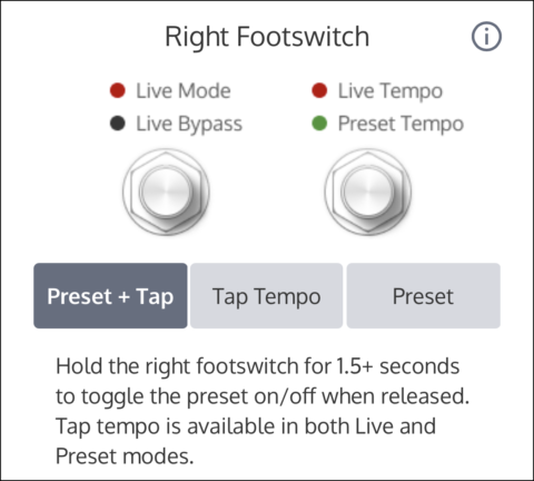 「プリセット + タップ」に設定すると、右のフットスイッチは複数の機能を有します。