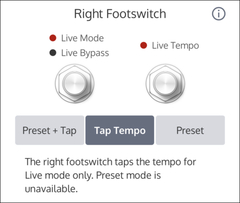 右フットスイッチの動作は、お好みの設定に変更できます。一方、左側のフットスイッチは常時ライブモードを切り替えるためのものとなります。つまり、ライブモードにおいては、現在見えているノブとスイッチの状態が出音と直結しています(タップテンポを使った時の
